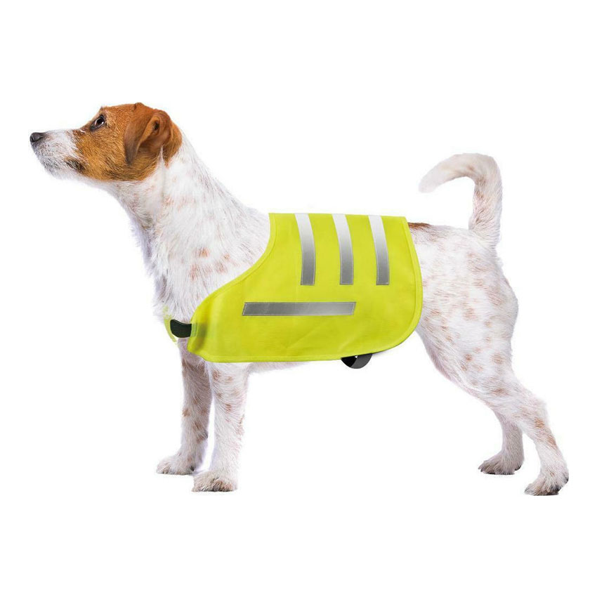 Ανακλαστικό γιλέκο ασφαλείας κατασκευασμένο από πολυεστερικό υλικό σε κίτρινο φωσφοριζέ χρώμα με ανακλαστικές οριζόντιες γραμμές, ρυθμιζόμενο με ιμάντες δέσης που κουμπώνουν με αυτοκόλλτα velcro, κατάλληλο για να το φοράτε στο σκύλο στη βόλτα σας, ώστε να παραμένει ορατός από διερχόμενους οδηγούς κατά την διάρκεια της ημέρας ή και της νύχτας. Ιδανική λύση για να σας συνοδεύει ο μικρός σας φίλος σε οποιαδήποτε εξόρμηση ή βόλτα με ασφάλεια και προστασία.