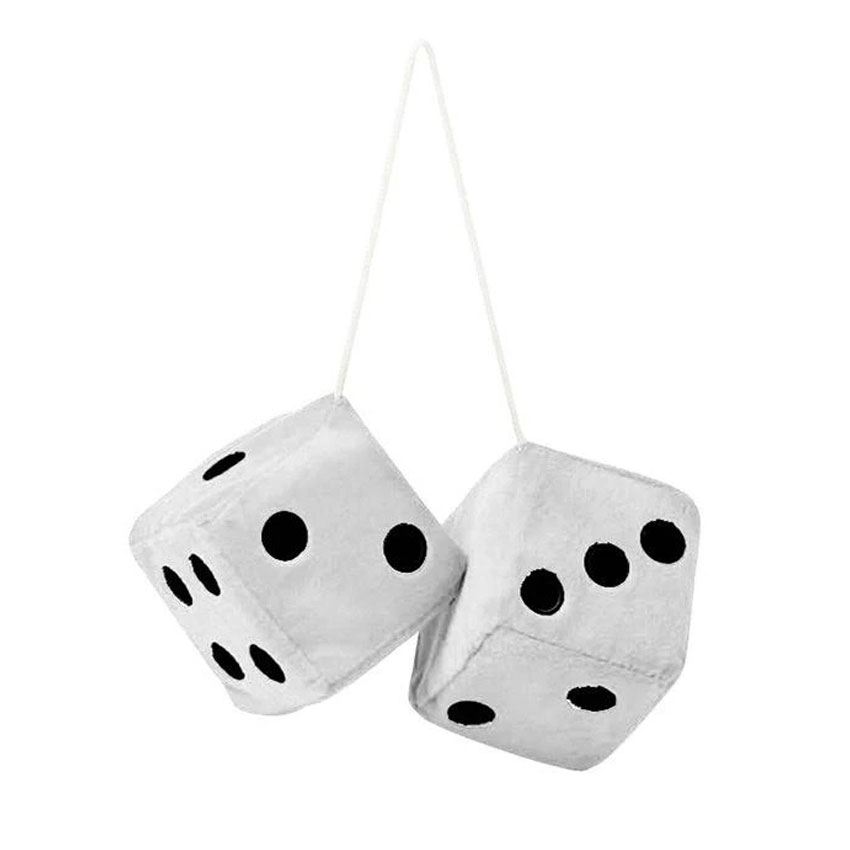 Διακοσμητικά ζάρια σε λευκό χρώμα συνδεμένα με κορδόνι που μπορούν να κρεματούν από τον εσωτερικό καθρέπτη του οχήματος σας.