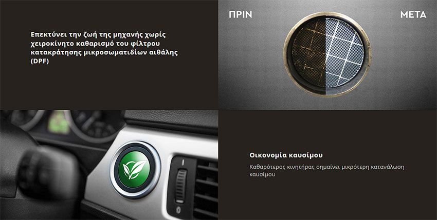 Επαγγελματικό καθαριστικό-προστατευτικό Diesel DPF ειδικά σχεδιασμένο για την αφαίρεση σωματιδίων άκαυστης αιθάλης και άνθρακα από τα φίλτρα κινητήρων diesel, αυξάνοντας τη διάρκεια ζωής του κινητήρα. Μικρές μετακινήσεις και πολλά σταμάτα-ξεκίνα στην κίνηση της πόλης προκαλούν την φραγή του φίλτρου DPF. Τα ενεργά μόρια του προϊόντος δρουν ως καταλύτες και συμβάλλουν διαρκώς στον αυτοκαθαρισμό του φίλτρου.