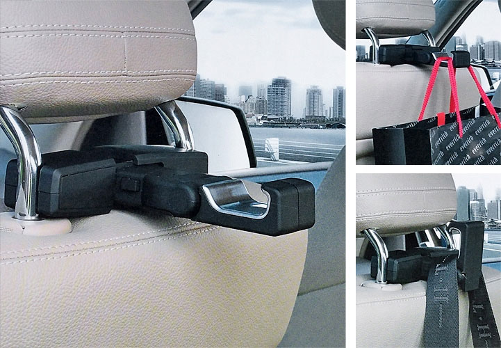 Κρεμάστρα - γάτζος που στερεώνεται στο προσκέφαλο των μπροστινών καθίσματων. Ιδανική για ρούχα που δεν θέλετε να ζαρώσουν, για τα ψώνια σας, για ομπρέλες κ.α. Διαθέτει ειδική εσοχή για την τοποθέτηση μπουκαλιών. Συσκευασία 2τμχ.