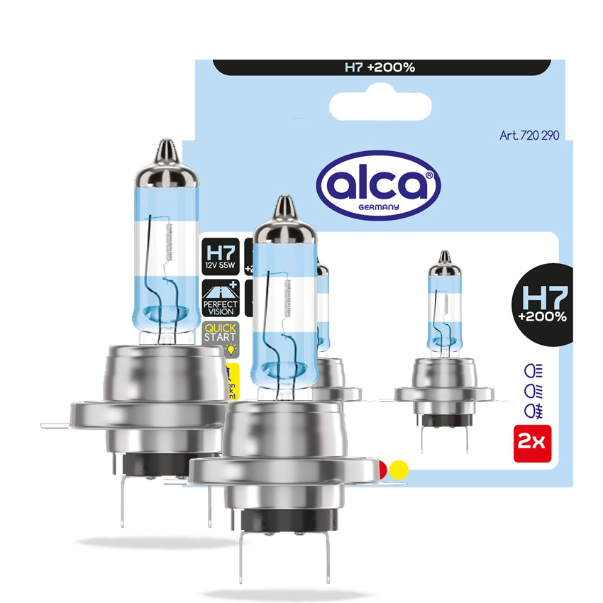 Οι λάμπες της Alca H7 παρέχουν 200% περισσότερο φως από τους συμβατικούς λαμπτήρες αλογόνου, προσφέροντας εξαιρετική ορατότητα και ανώτερη φωτεινότητα κατά την οδήγηση, χάρη στην ομοιογενή κατανομή του φωτός και τη βελτιωμένη εστίαση σε απόσταση μέσω γυαλιού χαλαζία. Αυτό εξασφαλίζει μειωμένη θάμβωση, γεγονός που αυξάνει την οδική ασφάλεια. Οι λαμπτήρες είναι ανθεκτικοί στους κραδασμούς και τις δονήσεις, ακόμη και σε κακές οδικές συνθήκες, γεγονός που εξασφαλίζει την ανθεκτικότητα και την αξιοπιστία τους. Με ονομαστική ισχύ 12V/55W και τη βάση εγκατάστασης Px26d, είναι κατάλληλοι για τα περισσότερα μοντέλα οχημάτων. Η απλή εγκατάσταση plug-and-play επιτρέπει την απροβλημάτιστη αντικατάσταση των παλαιών λαμπτήρων. Επιπλέον, είναι πιστοποιημένοι κατά ECE και εγκεκριμένοι για την οδική κυκλοφορία, γεγονός που εγγυάται υψηλό επίπεδο ασφάλειας.