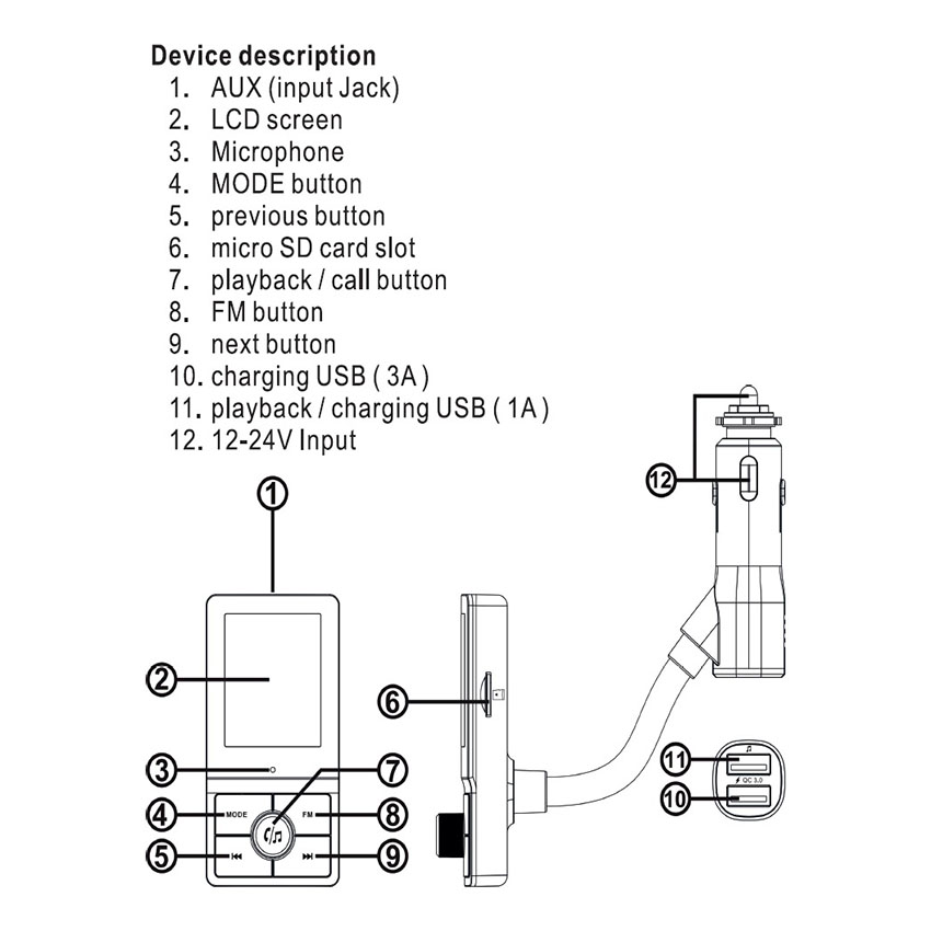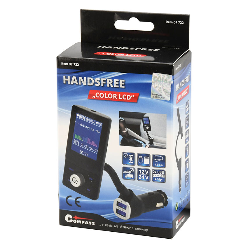 Το MP3 Player FM Transmitter Color LCD σας επιτρέπει να απολαύσετε τα αγαπημένα σας τραγούδια mp3 σε οποιοδήποτε στερεοφωνικό αυτοκινήτου διαθέτει ραδιόφωνο αλλά δεν διαθέτει θύρα Line-In ή USB. Το ενσωματωμένο Bluetooth Car Kit σας επιτρέπει να απαντάτε τις τηλεφωνικές κλήσεις του κινητού σας εύκολα, γρήγορα και με ασφάλεια. Επιπλέον μπορείτε να φορτίζεται το κινητό σας στις δύο εξόδους USB που διαθέτει. Διαθέτει εύκαμπτο βραχίονα, με δυνατότητα περιστροφής 360° για εύκολη ρύθμιση στην κατάλληλη θέση. Η συσκευή είναι συμβατή με όλες τις υποδοχές αναπτήρα 12 / 24V σε αυτοκίνητα και φορτηγά.