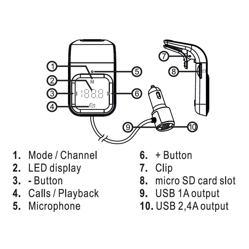 Το MP3 Player FM Transmitter σας επιτρέπει να απολαύσετε τα αγαπημένα σας τραγούδια mp3 σε οποιοδήποτε στερεοφωνικό αυτοκινήτου διαθέτει ραδιόφωνο αλλά δεν διαθέτει υποδοχή κάρτας μνήμης. Το ενσωματωμένο Bluetooth Car Kit σας επιτρέπει να απαντάτε τις τηλεφωνικές κλήσεις του κινητού σας εύκολα, γρήγορα και με ασφάλεια. Επιπλέον μπορείτε να φορτίζεται το κινητό σας σε μία από τις δύο εξόδους USB που διαθέτει. Η συσκευή είναι συμβατή με όλες τις υποδοχές αναπτήρα 12 / 24V σε αυτοκίνητα και φορτηγά. Περιλαμβάνει clip στο πίσω μέρος για να μπορείτε να τοποθετήσετε την συσκευή στον αεραγωγό του αυτοκινήτου σας.