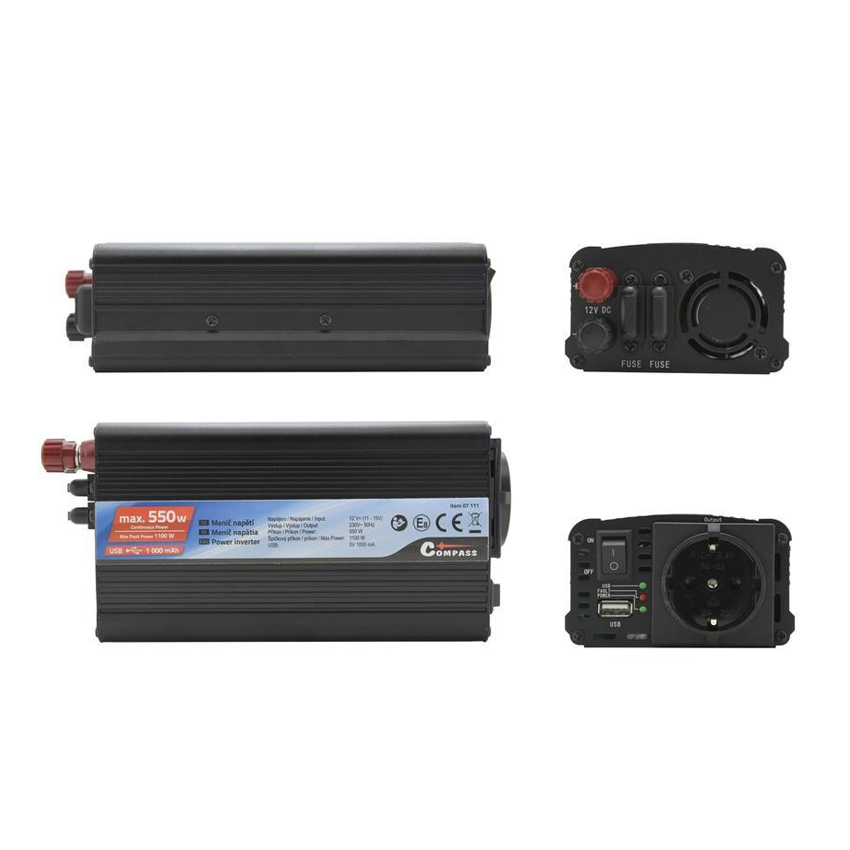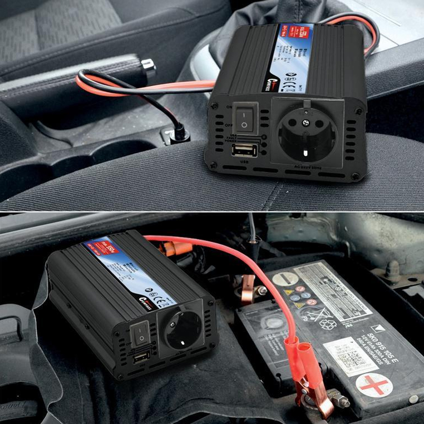 Μετατροπέας ρεύματος για τροφοδοσία οικιακών ηλεκτρικών συσκευών 230V από την πρίζα του αναπτήρα του αυτοκίνητου (12V). Συνδέεται μέσω του αναπτήρα του αυτοκινήτου ή απευθείας στην μπαταρία. Ιδανικό για laptop, φορτιστές κινητών, κάμερες, ξυριστική μηχανή, mp3 player κ.α. Διαθέτει έξοδο USB για απευθείας φόρτιση κινητών, mp3 player, άλλων συσκευών και ανεμιστήρα για καλύτερη ψύξη της συσκευής. Περιλαμβάνει διακόπτη on/off, λυχνίες ένδειξης λειτουργίας και σφάλματος.