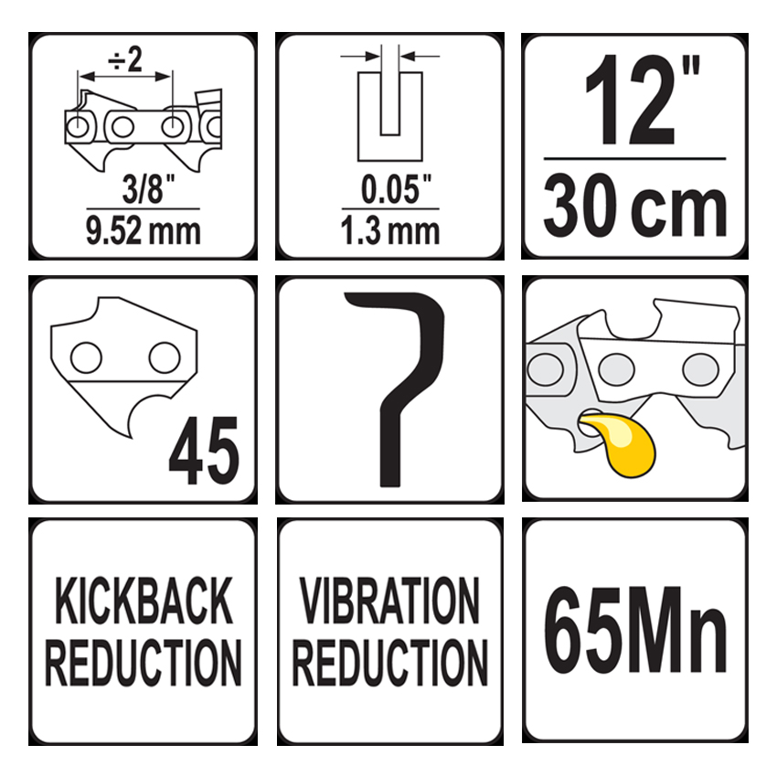 Αλυσίδα κοπής για βενζινοκίνητα και ηλεκτρικά αλυσοπρίονα της μάρκας Yato. Δόντια κοπής τύπου σμίλης με υψηλή ταχύτητα κοπής. Σχεδιασμένη για την κοπή καθαρού και μέτριας ρύπανσης ξύλου. Κατασκευασμένη από χάλυβα μαγγανίου Mn65, ο οποίος προσφέρει αυξημένη αντοχή σε θραύση, παρατείνοντας έτσι τη διάρκεια ζωής της αλυσίδας. Σύστημα λίπανσης, χάρη στο οποίο το λάδι κατανέμεται ομοιόμορφα σε όλο το μήκος της λάμας. Αυτό έχει ως αποτέλεσμα τη μείωση της αντίστασης τριβής, μειώνοντας τη θέρμανση του οδηγού και παρατείνοντας τη διάρκεια ζωής ολόκληρου του συστήματος κοπής.