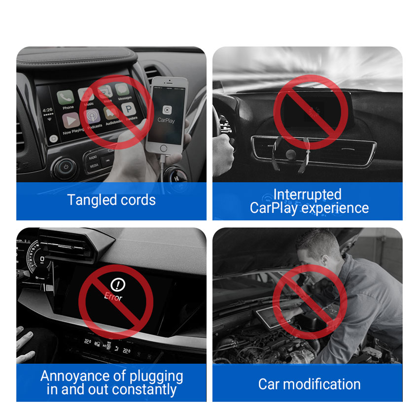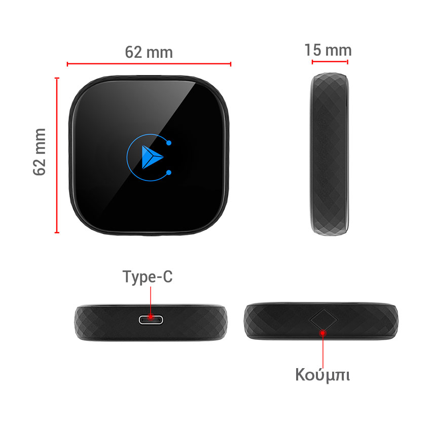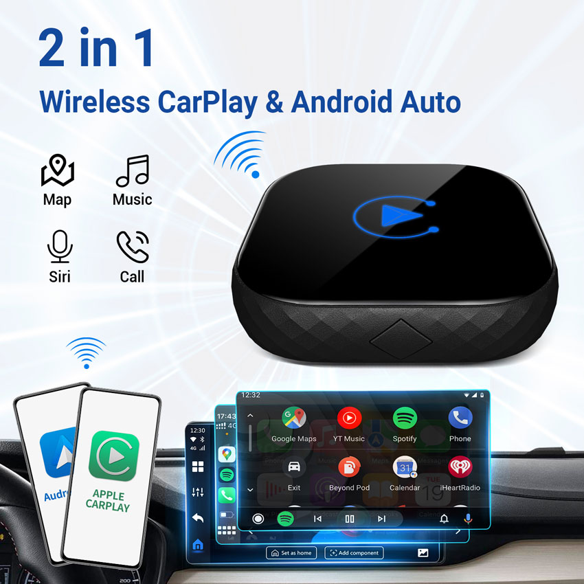 Αντάπτορας γενικής χρήσης για ασύρματη σύνδεση Apple CarPlay/ Android Auto ενσύρματα. Παραμένει ο έλεγχος των υποστηριζόμενων εφαρμογών οθόνη αφής, κουμπιά στο τιμόνι. Το τηλέφωνο συνδέεται αυτόματα με το headunit του οχήματος μέσω της μονάδας.