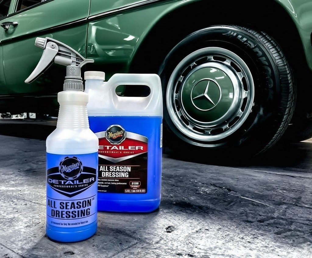 Το Meguiar’s Detailer All Season Dressing είναι ένα εξειδικευμένο επαγγελματικό προϊόν σε συσκευασία 3.78Lt, σχεδιασμένο να προσφέρει βαθιά λάμψη "υγρής όψης" (wet look) που διαρκεί σε όλες τις εξωτερικές πλαστικές και λαστιχένιες επιφάνειες του αυτοκινήτου. Η σύνθεσή του είναι ιδιαίτερα ανθεκτική στις καιρικές συνθήκες και συμβατή με τους κανονισμούς CARB VOC, προσφέροντας άμεσο αναζωογονητικό αποτέλεσμα ακόμα και σε παλιές ή φθαρμένες επιφάνειες από καουτσούκ και βινύλιο. Το προϊόν είναι έτοιμο προς χρήση και εφαρμόζεται σε καθαρές, στεγνές επιφάνειες με ψεκασμό ή σφουγγάρι, ενώ απαιτείται προσοχή ώστε να αποφεύγεται η χρήση του σε επιφάνειες όπου το γλίστρημα είναι ανεπιθύμητο, όπως τα ελαστικά και τα καθίσματα μοτοσυκλετών.
