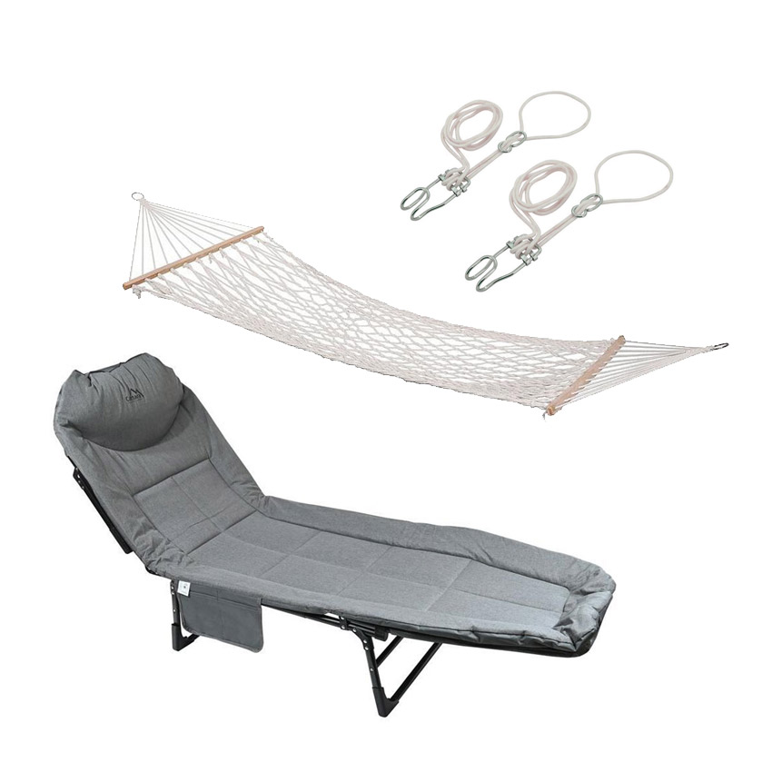 Αιώρα εξωτερικού χώρου από βαμβακερό δίχτυ με δύο κρίκους στερέωσης. Είναι κατάλληλη για στιγμές χαλάρωσης στο κάμπινγκ, στον κήπο ή οπουδήποτε αλλού στην φύση. Η αιώρα είναι εφοδιασμένη με δύο ξύλινες ράβδους στα άκρα για καλύτερη σταθερότητα. Είναι σχεδιασμένη για ένα άτομο και έχει διαστάσεις 80x200cm με μέγιστο επιτρεπτό βάρος 115kg. Διπλώνεται και μεταφέρεται γρήγορα και εύκολα.