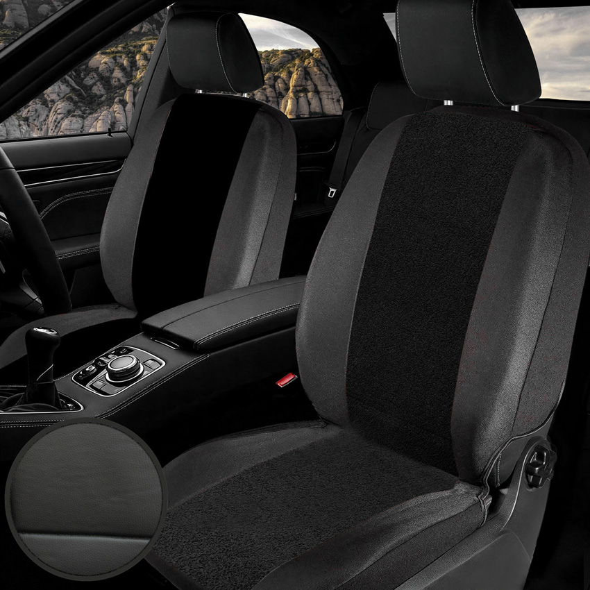 Ημικαλύμματα καθισμάτων universal με αποσπώμενα προσκέφαλα, κατασκευασμένα από υψηλής ποιότητας τεχνόδερμα μαύρου χρώματοςγια τα εμπρός καθίσματα, με μεγάλη αντοχή στο χρόνο.
