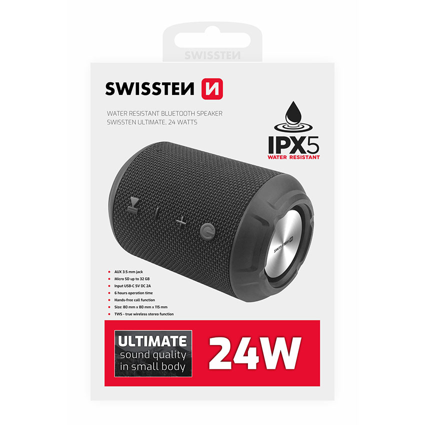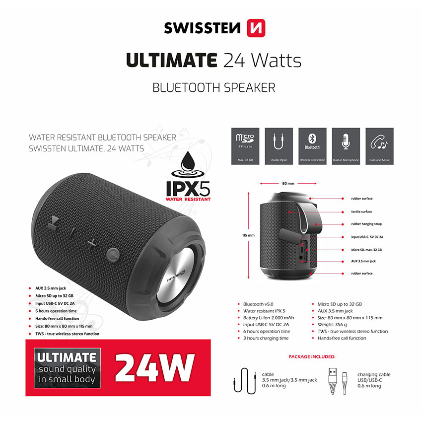Το ασύρματο ηχείο bluetooth Ultimate αποτελεί την κατάλληλη επιλογή ώστε να ακούτε την αγάπημένη σας μουσική όπου και αν βρίσκεστε. Ξεχωρίζει γα τον τέλειο ήχο ακόμα και σε υψηλή ένταση και τον ελκυστικό σχεδιασμό του από συνδυασμό λαστιχένιων και υφασμάτινων επιφανειών. Διαθέτει προστασία IPX5 από το νερό ώστε να μπορεί να σας συνοδεύει στις υπαίθριες δραστηριότητες (σε βουνό, παραλία, σκάφος) και όχι μόνο. Μπορείτε να το συνδέσετε με το smartphone, το tablet ή ακόμα και τον φορητό υπολογιστή σας μέσω ασύρματης τεχνολογίας bluetooth 5.0, η οποία εγγυάται μεγάλη αντοχή, τέλειο ήχο και μεγάλη εμβέλεια. Διαθέτει ακουστικό για παράλληλη πραγματοποίηση κλήσεων hands-free, όπως και υποδοχή κάρτας μνήμης micro SD (έως 32GB) για να ακούτε τα αγαπημένα σας τραγούδια. Η συσκευασία περιλαμβάνει καλώδιο jack 3,5 mm / jack 3,5 mm και καλώδιο φόρτισης usb / micro usb.
