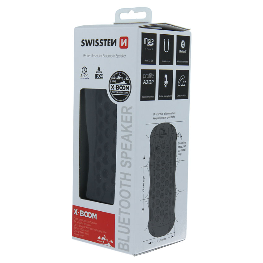 Το ασύρματο ηχείο bluetooth X-Boom αποτελεί την κατάλληλη επιλογή ώστε να ακούτε την αγάπημένη σας μουσική όπου και αν βρίσκεστε. Χάρη στην ανθεκτική λαστιχένια επιφάνεια και την αδιάβροχη προστασία IPX5 μπορεί να σας συνοδεύει στις υπαίθριες δραστηριότητες (σε βουνό, παραλία, σκάφος) και όχι μόνο. Μπορείτε να το συνδέσετε με το smartphone, το tablet ή ακόμα και τον φορητό υπολογιστή σας μέσω ασύρματης τεχνολογίας bluetooth 2.1, η οποία εγγυάται χαμηλή κατανάλωση ενέργειας, μεγάλη αντοχή, τέλειο ήχο και μεγάλη εμβέλεια. Διαθέτει ακουστικό για παράλληλη πραγματοποίηση κλήσεων hands-free, όπως και υποδοχή κάρτας μνήμης micro SD (έως 32GB) για να ακούτε τα αγαπημένα σας τραγούδια. Η συσκευασία περιλαμβάνει καλώδιο jack 5 mm / jack 3,5 mm και καλώδιο φόρτισης usb / micro usb.