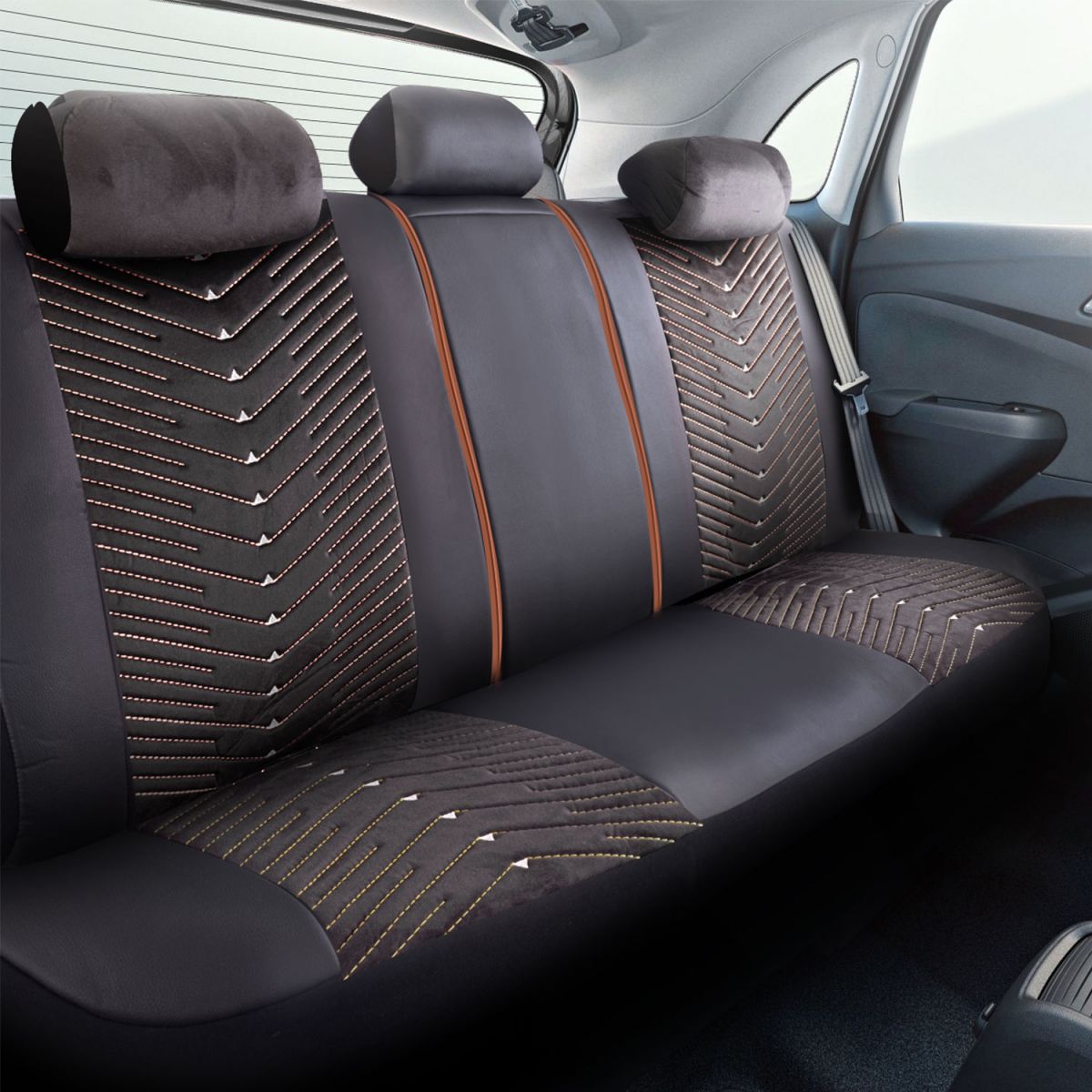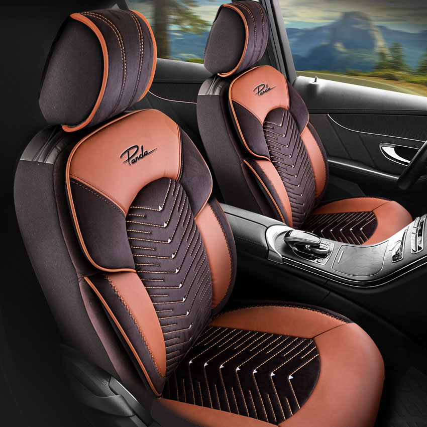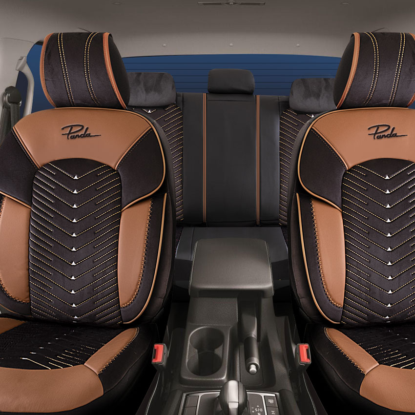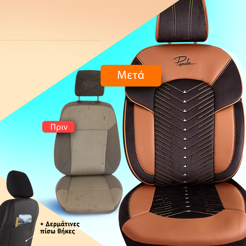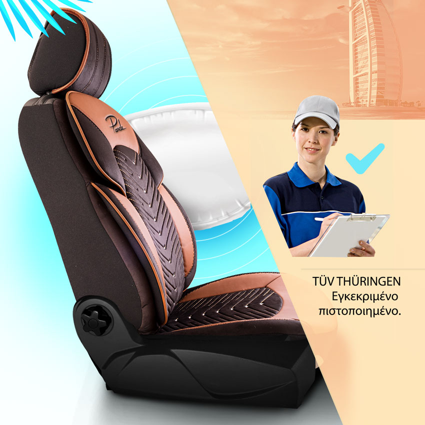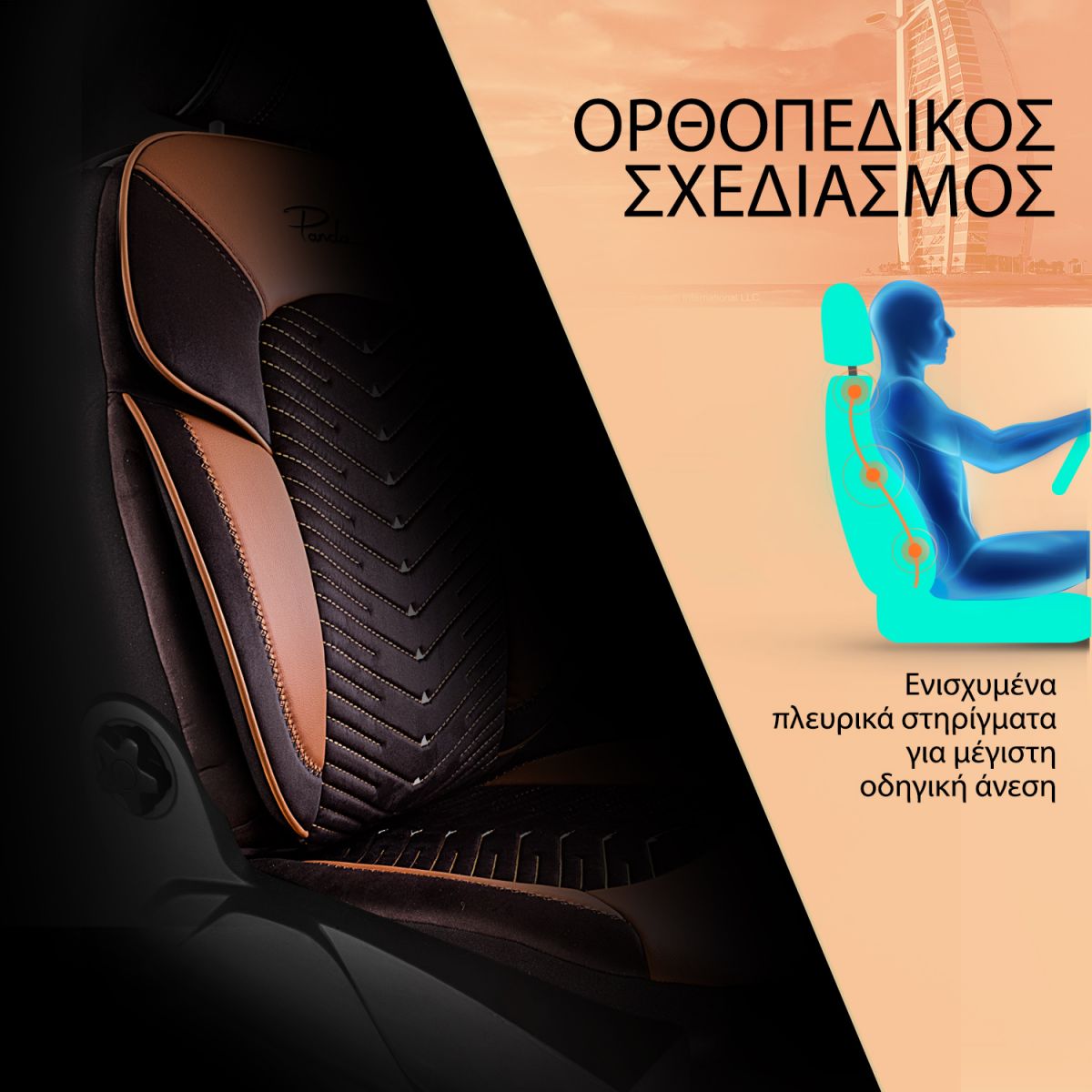 Καλύμματα καθισμάτων με ανεξάρτητα προσκέφαλα για όλα τα καθίσματα του αυτοκινήτου σας, σε μαύρο - ταμπά χρώμα με τεχνόδερμα. Είναι ανθεκτικά στην χρήση, έχει ορθοπεδική κατασκευή και ύφασμα οικολογικού δέρματος/ζακάρ υψηλής ποιότητας σύμφωνα με το Πρότυπο 100 και το ISO 9001:2015. Χάρη στον πατενταρισμένο σχεδιασμό του, προσθέτει εξαιρετική κομψότητα στο όχημά σας και δημιουργεί έναν σπορ χαρακτήρα.