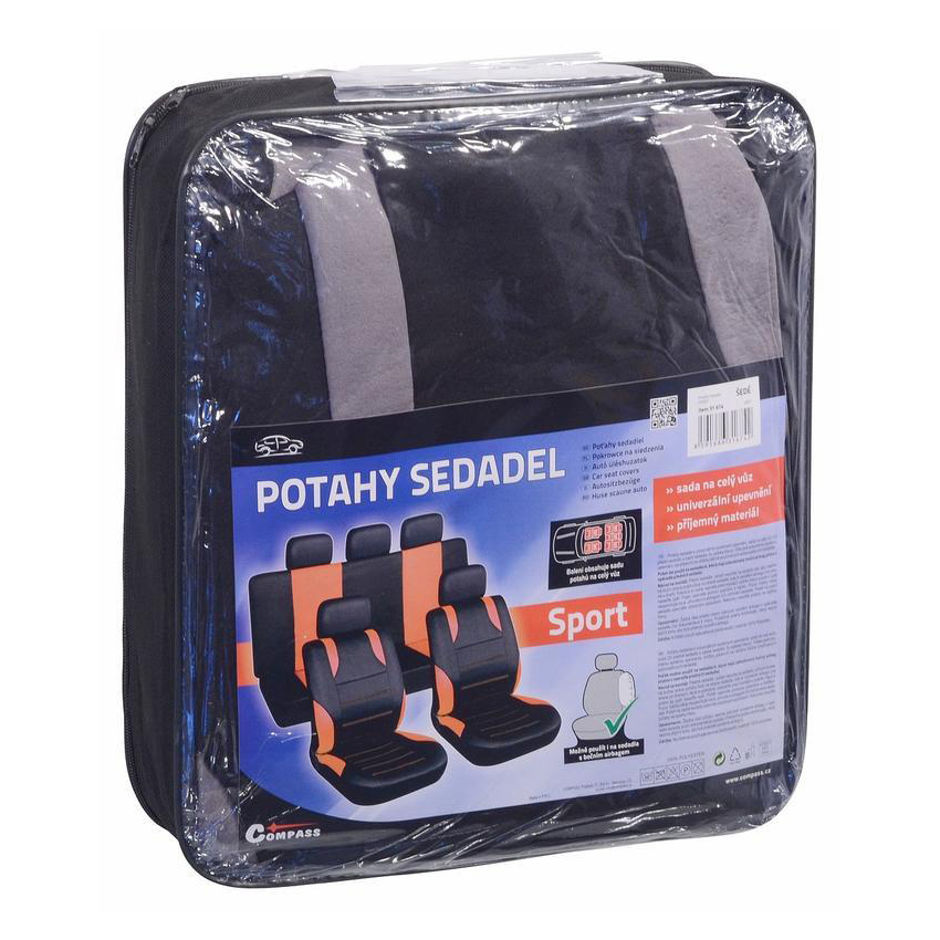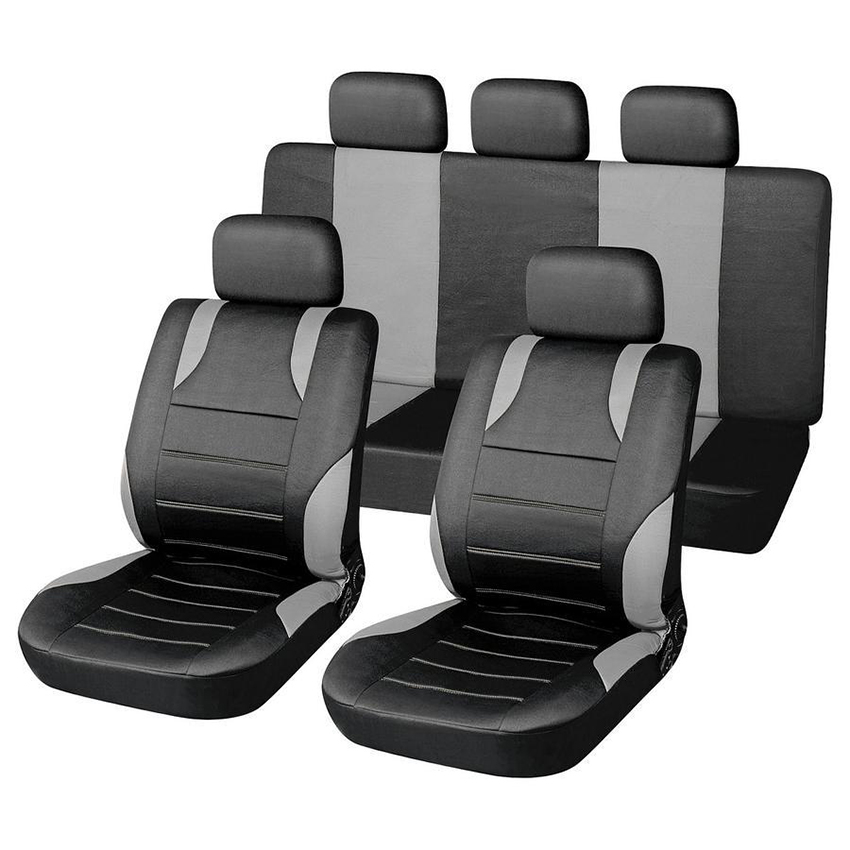 Καλύμματα καθισμάτων με universal εφαρμογή για όλο το αυτοκίνητο, συνδυασμό μαύρο-γκρι χρώμα, κατασκευασμένα από 100% πολυεστέρα με λεπτό αφρώδες υλικό για μεγαλύτερη άνεση. Σχεδιασμένα για να ταιριάζουν στα περισσότερα αυτοκίνητα. Κατάλληλα για καθίσματα εξοπλισμένα με πλευρικούς αερόσακους. Πλένονται στο πλυντήριο στους 30 °C.