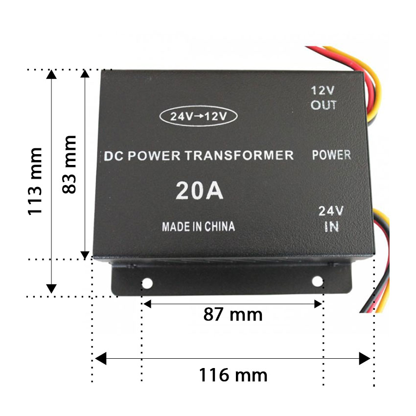 Μετατροπέας τάσης 24V σε 12V με ισχύ εξόδου 20A. Κατάλληλος για οχήματα με τάση 24V. Μπορεί να χρησιμοποιηθεί για Laptop, Tablet, Ραδιόφωνο, Τηλεόραση
