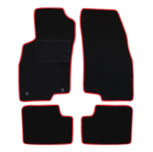 Πατάκια δαπέδου μοκέταςclan σε μαύρο χρώμα με κόκκινο ρέλι, με 2 στρογγυλά κουμπώματα και 2 velcro (σχρατς) στο πατάκι του οδηγού, ραμμένη ακριβώς για Fiat Grande Punto μοντ. 2005 - 2012.