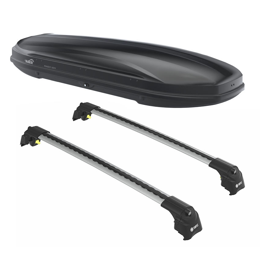 Μπάρες οροφής Turtle Air2 από υψηλής ποιότητας αλουμίνιο σε ασημί χρώμα σετ με μπαγκαζιέρα HAKR Magic Line 450 αεροδυναμικού και κομψού σχεδιασμού σε μαύρο χρώμα, γυαλιστερή υφή και χωρητικότητας φορτίου 450 lt.