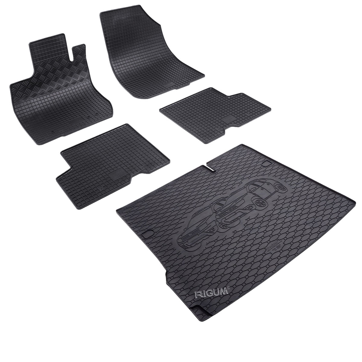 Πατάκια δαπέδου σετ με πατάκι πορτ μπαγκάζ, Rigum, κατασκευασμένα από υψηλής ποιότητας άοσμο ανθεκτικό καουτσούκ, φιλικό προς το περιβάλλον. Αντιολισθητικά και πολύ εύκολα στο καθάρισμα. Το χείλος που διαθέτουν (περίπου 1cm τα πατάκια δαπέδου / περίπου 2cm το πατάκι πορτ μπαγκάζ) και η ειδικά διαμορφωμένη κυψελωτή επιφάνεια συγκρατούν νερά, λάσπες, χώματα και χιόνι, διατηρώντας καθαρό το εσωτερικό του αυτοκινήτου. Διαθέτουν άψογη εφαρμογή.