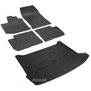 Πατάκια δαπέδου σετ με πατάκι πορτ μπαγκάζ, Rigum, κατασκευασμένα από υψηλής ποιότητας άοσμο ανθεκτικό καουτσούκ, φιλικό προς το περιβάλλον. Αντιολισθητικά και πολύ εύκολα στο καθάρισμα. Το χείλος που διαθέτουν (περίπου 1cm τα πατάκια δαπέδου / περίπου 2cm το πατάκι πορτ μπαγκάζ) και η ειδικά διαμορφωμένη κυψελωτή επιφάνεια συγκρατούν νερά, λάσπες, χώματα και χιόνι, διατηρώντας καθαρό το εσωτερικό του αυτοκινήτου. Διαθέτουν άψογη εφαρμογή.