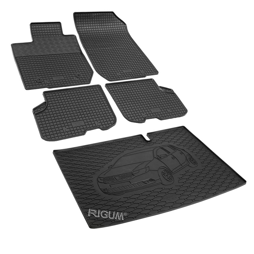 Πατάκια δαπέδου σετ με πατάκι πορτ μπαγκάζ, Rigum, κατασκευασμένα από υψηλής ποιότητας άοσμο ανθεκτικό καουτσούκ, φιλικό προς το περιβάλλον. Αντιολισθητικά και πολύ εύκολα στο καθάρισμα. Το χείλος που διαθέτουν (περίπου 1cm τα πατάκια δαπέδου / περίπου 2cm το πατάκι πορτ μπαγκάζ)  και η ειδικά διαμορφωμένη κυψελωτή επιφάνεια συγκρατούν νερά, λάσπες, χώματα και χιόνι, διατηρώντας καθαρό το εσωτερικό του αυτοκινήτου. Διαθέτουν άψογη εφαρμογή.