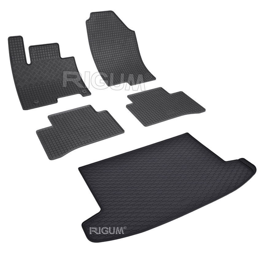 Πατάκια δαπέδου σετ με πατάκι πορτ μπαγκάζ, Rigum, κατασκευασμένα από υψηλής ποιότητας άοσμο ανθεκτικό καουτσούκ, φιλικό προς το περιβάλλον. Αντιολισθητικά και πολύ εύκολα στο καθάρισμα. Το χείλος που διαθέτουν (περίπου 1cm τα πατάκια δαπέδου / περίπου 2cm το πατάκι πορτ μπαγκάζ) και η ειδικά διαμορφωμένη κυψελωτή επιφάνεια συγκρατούν νερά, λάσπες, χώματα και χιόνι, διατηρώντας καθαρό το εσωτερικό του αυτοκινήτου. Διαθέτουν άψογη εφαρμογή.