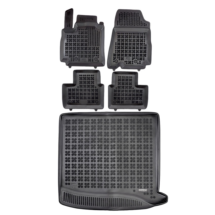 Πατάκια δαπέδου σετ με πατάκι πορτ μπαγκάζ τύπου σκαφάκια, κατασκευασμένα από υψηλής ποιότητας άοσμο ανθεκτικό καουτσούκ, φιλικό προς το περιβάλλον. Αντιολισθητικά και πολύ εύκολα στο καθάρισμα. Το χείλος που διαθέτουν (περίπου 3 - 4 cm τα πατάκια δαπέδου / περίπου 4 - 6cm το πατάκι πορτ μπαγκάζ) και η ειδικά διαμορφωμένη επιφάνεια συγκρατούν νερά, λάσπες, χώματα και χιόνι, διατηρώντας καθαρό το εσωτερικό του αυτοκινήτου. Διαθέτουν άψογη εφαρμογή.