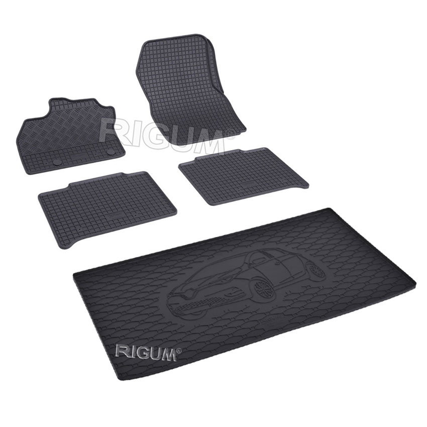 Πατάκια δαπέδου σετ με πατάκι πορτ μπαγκάζ, Rigum, κατασκευασμένα από υψηλής ποιότητας άοσμο ανθεκτικό καουτσούκ, φιλικό προς το περιβάλλον. Αντιολισθητικά και πολύ εύκολα στο καθάρισμα. Το χείλος που διαθέτουν (περίπου 1cm τα πατάκια δαπέδου / περίπου 2cm το πατάκι πορτ μπαγκάζ) και η ειδικά διαμορφωμένη κυψελωτή επιφάνεια συγκρατούν νερά, λάσπες, χώματα και χιόνι, διατηρώντας καθαρό το εσωτερικό του αυτοκινήτου. Διαθέτουν άψογη εφαρμογή.