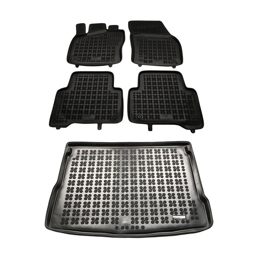 Πατάκια δαπέδου σετ με πατάκι πορτ μπαγκάζ τύπου σκαφάκια, κατασκευασμένα από υψηλής ποιότητας άοσμο ανθεκτικό καουτσούκ, φιλικό προς το περιβάλλον. Αντιολισθητικά και πολύ εύκολα στο καθάρισμα. Το χείλος που διαθέτουν (περίπου 3 - 4 cm τα πατάκια δαπέδου / περίπου 4 - 6cm το πατάκι πορτ μπαγκάζ) και η ειδικά διαμορφωμένη επιφάνεια συγκρατούν νερά, λάσπες, χώματα και χιόνι, διατηρώντας καθαρό το εσωτερικό του αυτοκινήτου. Διαθέτουν άψογη εφαρμογή.