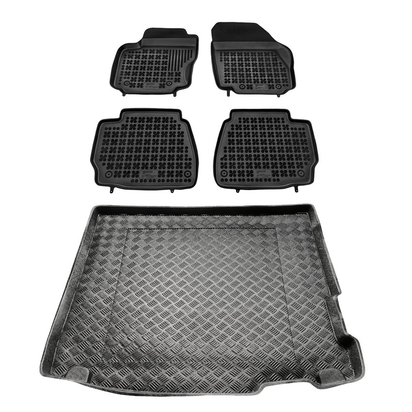 Πατάκια δαπέδου σετ με πατάκι πορτ μπαγκάζ τύπου σκαφάκιαRezaw , κατασκευασμένα από υψηλής ποιότητας άοσμο ανθεκτικό καουτσούκ, φιλικό προς το περιβάλλον. Αντιολισθητικά και πολύ εύκολα στο καθάρισμα. Το χείλος που διαθέτουν (περίπου 3 - 4 cm τα πατάκια δαπέδου / περίπου 4 - 6cm το πατάκι πορτ μπαγκάζ)  και η ειδικά διαμορφωμένη επιφάνεια συγκρατούν νερά, λάσπες, χώματα και χιόνι, διατηρώντας καθαρό το εσωτερικό του αυτοκινήτου. Διαθέτουν άψογη εφαρμογή.