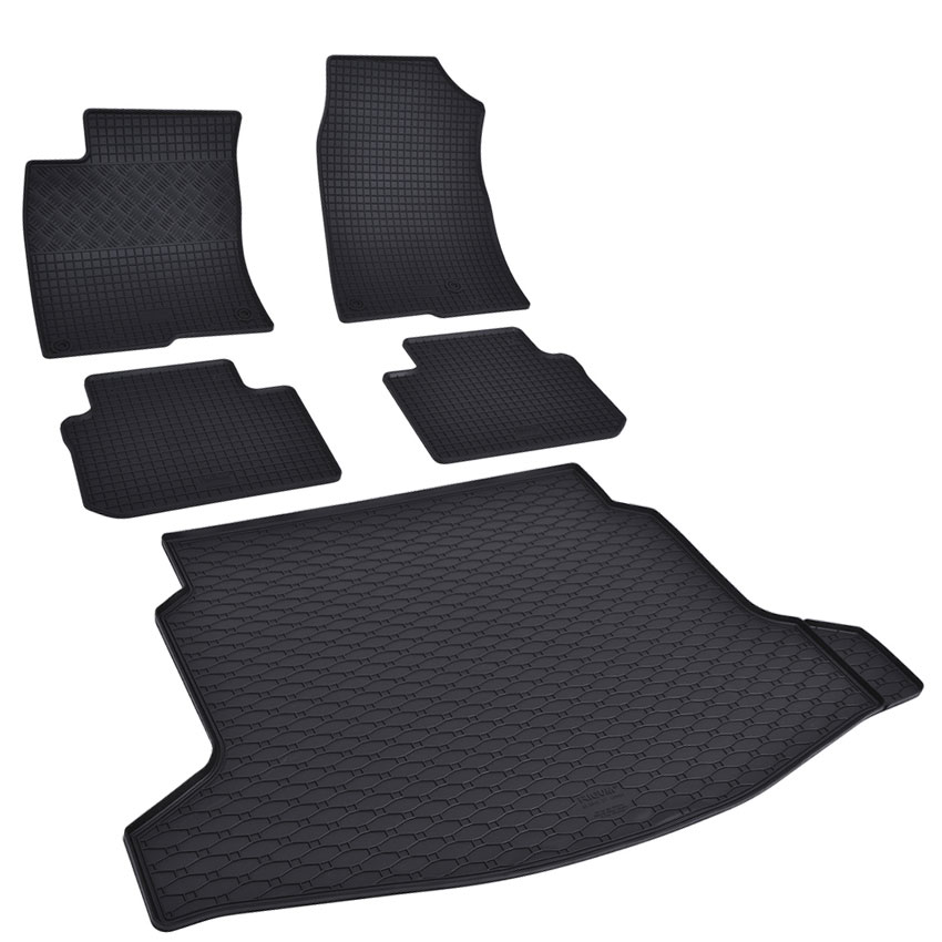 Πατάκια δαπέδου σετ με πατάκι πορτ μπαγκάζ τύπου σκαφάκιαRezaw , κατασκευασμένα από υψηλής ποιότητας άοσμο ανθεκτικό καουτσούκ, φιλικό προς το περιβάλλον. Αντιολισθητικά και πολύ εύκολα στο καθάρισμα. Το χείλος που διαθέτουν (περίπου 3 - 4 cm τα πατάκια δαπέδου / περίπου 4 - 6cm το πατάκι πορτ μπαγκάζ)  και η ειδικά διαμορφωμένη επιφάνεια συγκρατούν νερά, λάσπες, χώματα και χιόνι, διατηρώντας καθαρό το εσωτερικό του αυτοκινήτου. Διαθέτουν άψογη εφαρμογή.
