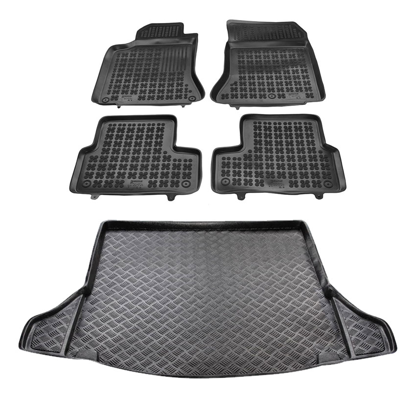 Πατάκια δαπέδου σετ με πατάκι πορτ μπαγκάζ τύπου σκαφάκιαRezaw , κατασκευασμένα από υψηλής ποιότητας άοσμο ανθεκτικό καουτσούκ, φιλικό προς το περιβάλλον. Αντιολισθητικά και πολύ εύκολα στο καθάρισμα. Το χείλος που διαθέτουν (περίπου 3 - 4 cm τα πατάκια δαπέδου / περίπου 4 - 6cm το πατάκι πορτ μπαγκάζ)  και η ειδικά διαμορφωμένη επιφάνεια συγκρατούν νερά, λάσπες, χώματα και χιόνι, διατηρώντας καθαρό το εσωτερικό του αυτοκινήτου. Διαθέτουν άψογη εφαρμογή.