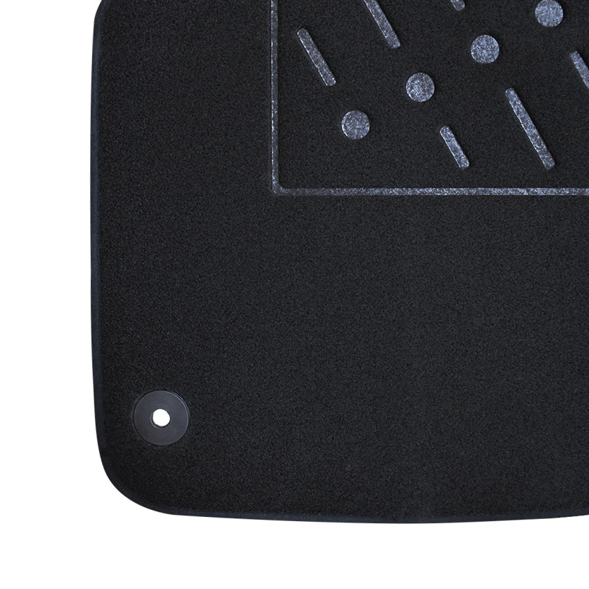 Πατάκια δαπέδου μοκέτας ποιότητας Premium, σε μαύρο χρώμα. Διαθέτουν clips σταθεροποίησης.