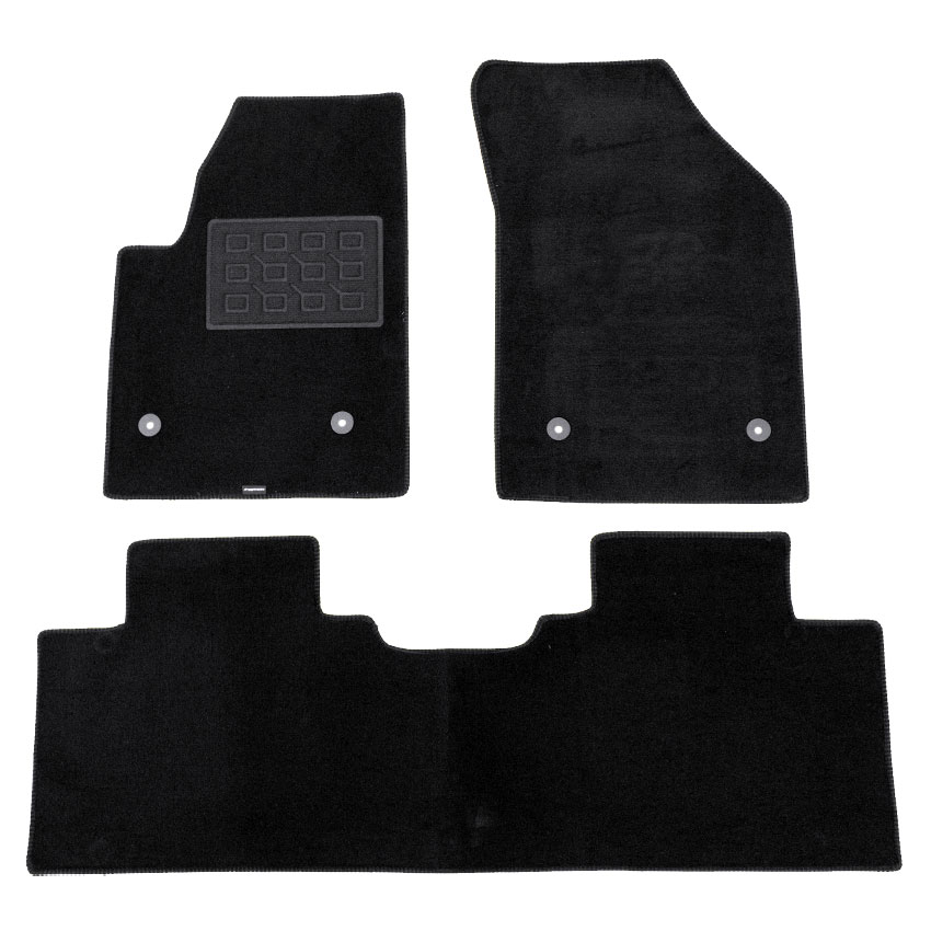 Πατάκια δαπέδου μοκέτας Superior σε μαύρο χρώμα. Διαθέτουν 4 στρόγγυλα κουμπωματα, ενισχυμένο πάτημα στο πατάκι του οδηγού, αντιολισθητικό και στεγανό υπόστρωμα.
