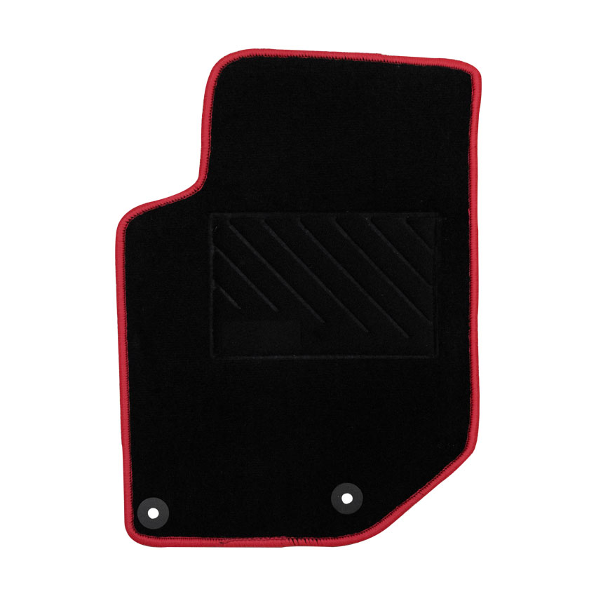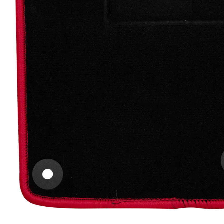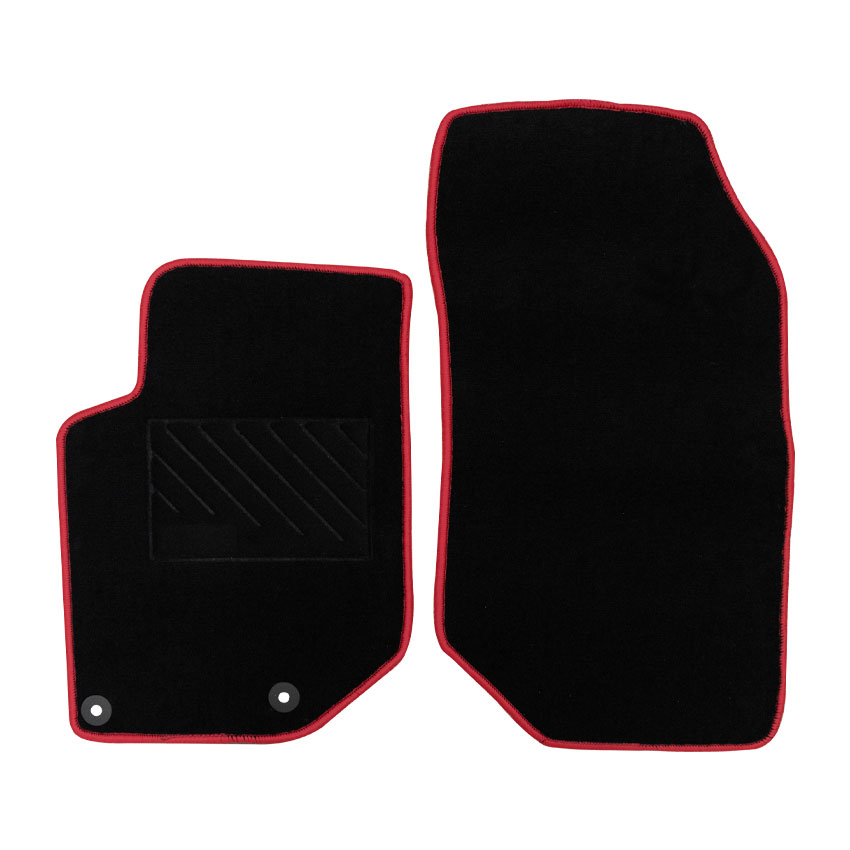 Πατάκια δαπέδου μοκέτας ποιότητας Tuft , σε μαύρο χρώμα με κόκκινο ρέλι. Διαθέτουν 2 στρόγγυλα κουμπώματα στο πατάκι του οδηγού