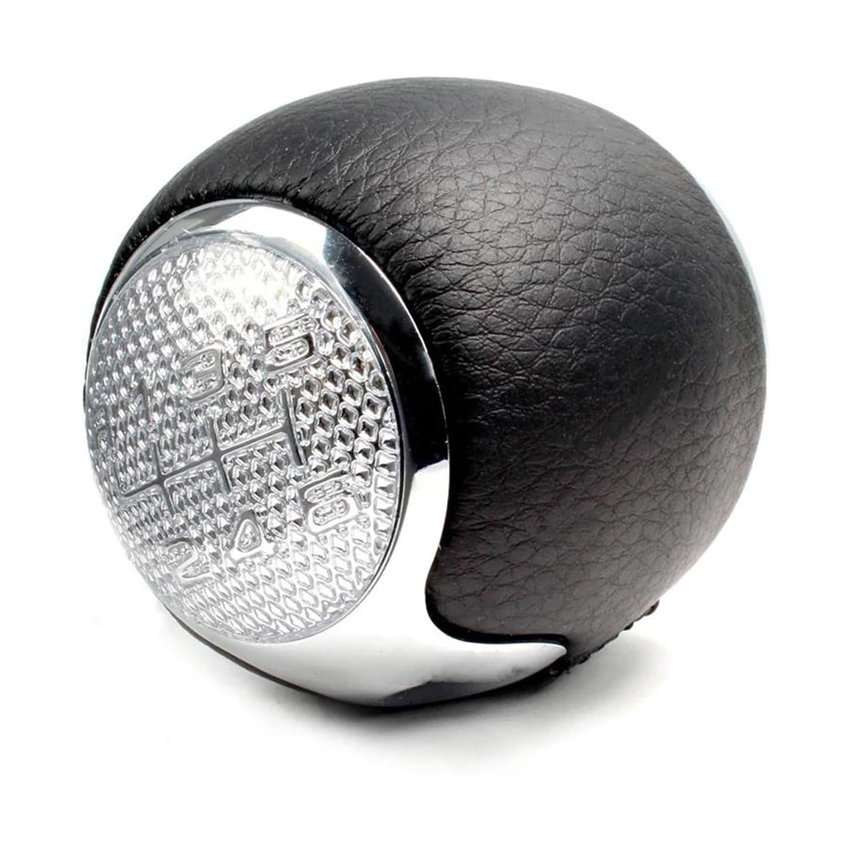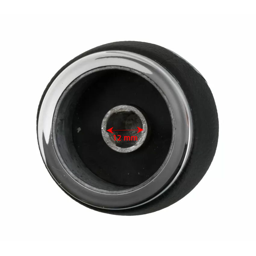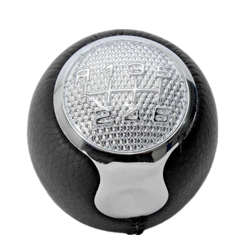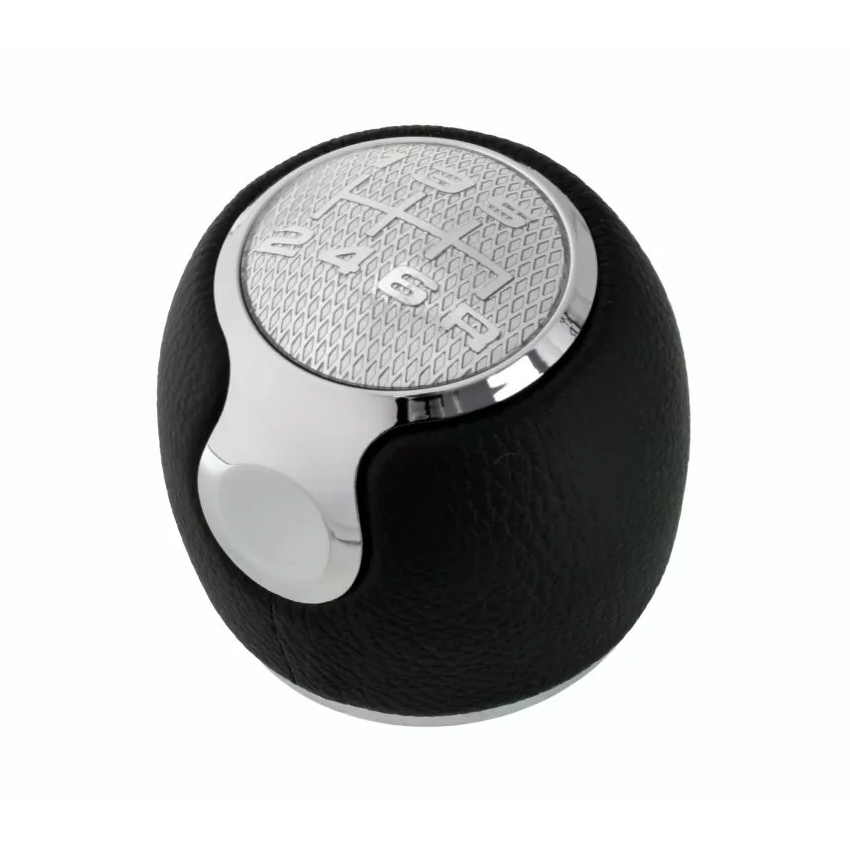Πόμολο ταχυτήτων ασημί/ μαύρο με αριθμούς ταχυτήτων (1-6) και όπισθεν (R) αριστερά κάτω, κατασκευασμένο από μαύρο τεχνόδερμα υψηλής ποιότητας με ασημί λεπτομέρειες.