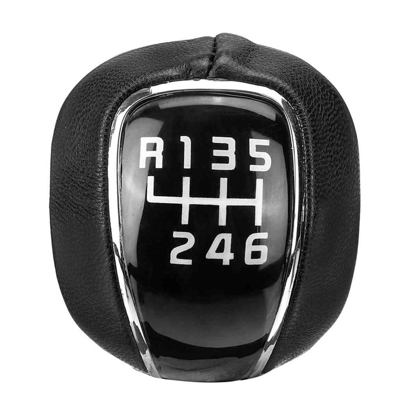 Μαύρο πόμολο από δέρμα με λεπτομέρειες χρωμίου. Διαθέτει αριθμούς ταχυτήτων (1-6) και όπισθεν (R).