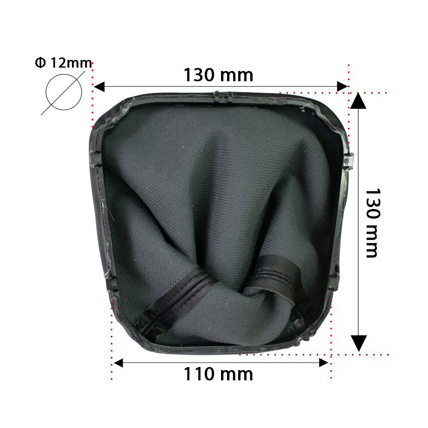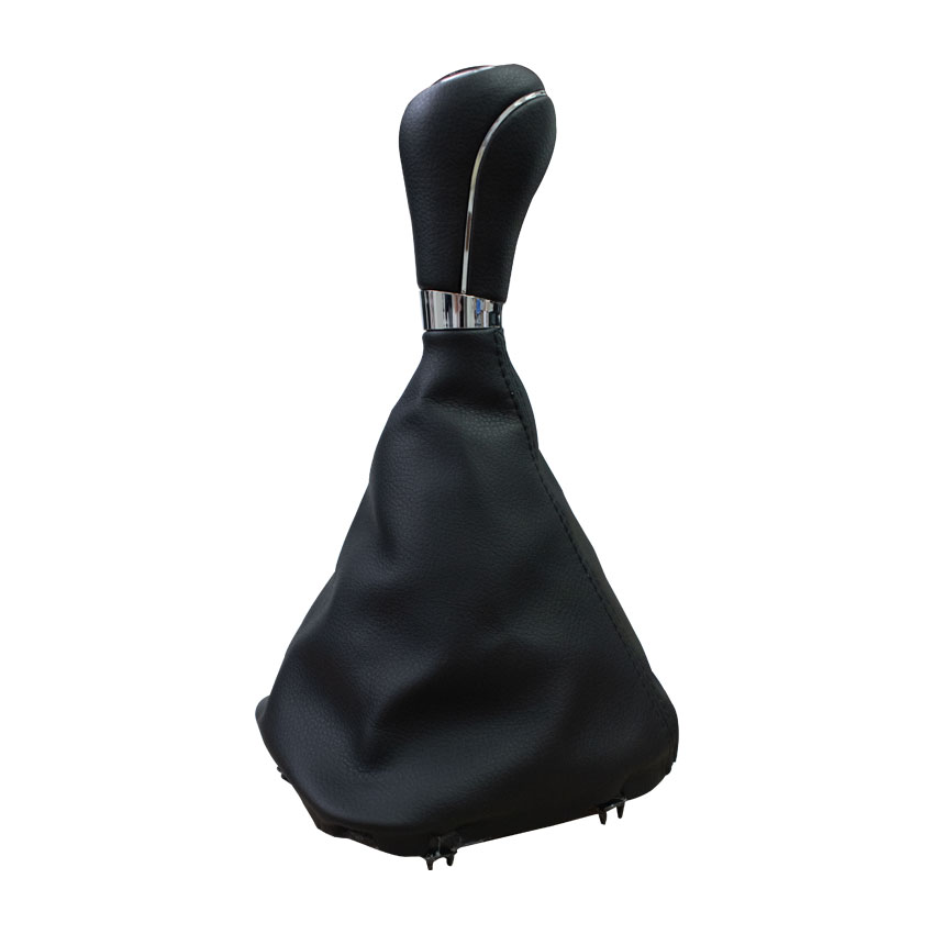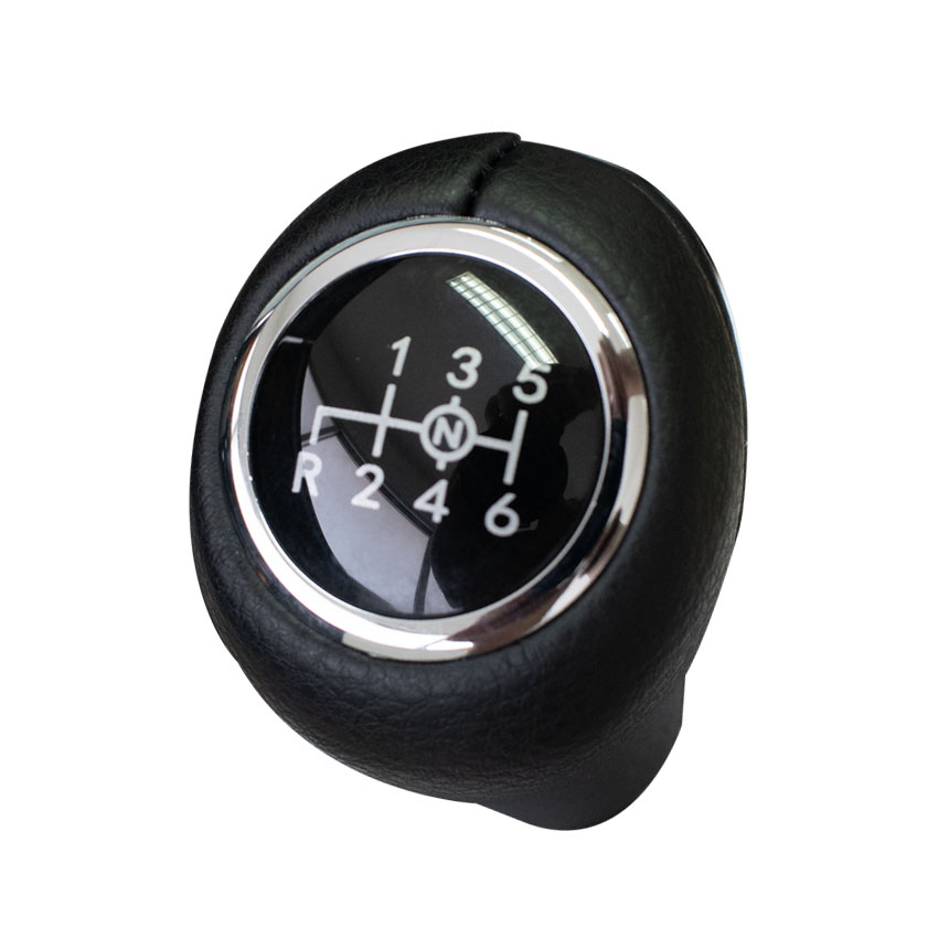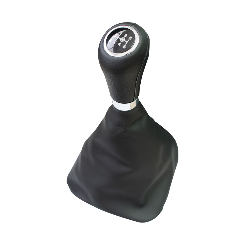 Πόμολο ταχυτήτων με αριθμούς (1-6) και όπισθεν (R) προς τα κάτω σε συνδυασμό με φυσούνα (φούσκα) από εξαιρετικής ποιότητας τεχνόδερμα σε μαύρο χρώμα με μαύρο πλαίσιο τοποθέτησης.