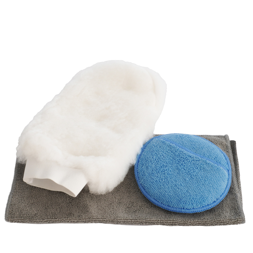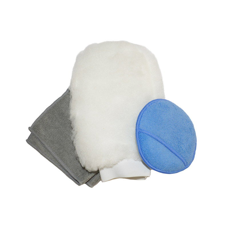 Σετ καθαρισμού- γυαλίσματός απαραίτητο για τον τέλειο καθαρισμό και το γυάλισμα του οχήματος σας. Το σφουγγάρι καθαρισμού με μικροΐνες είναι κατασκευασμένο από υψηλής ποιότητας μικροΐνες που εξασφαλίζει ομαλή και ομοιόμορφη εφαρμογή προϊόντων αυτοκινήτου, όπως κερί και βερνίκι, χωρίς ραβδώσεις ή σημάδια. Το πανί μικροϊνών, το οποίο μπορεί να χρησιμοποιηθεί είτε για το στέγνωμα του αυτοκινήτου (ένα ελαφρώς υγρό πανί μικροϊνών απορροφά αποτελεσματικά το νερό) είτε για το τελικό γυάλισμα της εφαρμοσμένης προστασίας αμαξώματος (το σκούπισμα των υπερβολικών ιχνών κεριών θα αποτρέψει το άλειμμα). Τέλος το γάντι διαθέτει μια ειδική σύνθεση ινών που εξασφαλίζουν τέλεια ολίσθηση του σφουγγαριού στην επιφάνεια κατά το γυάλισμα. Δεν αφήνει γρατσουνιές.