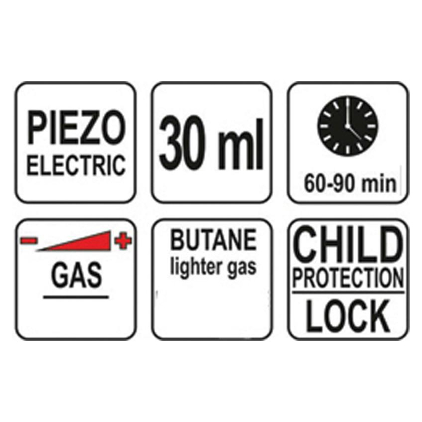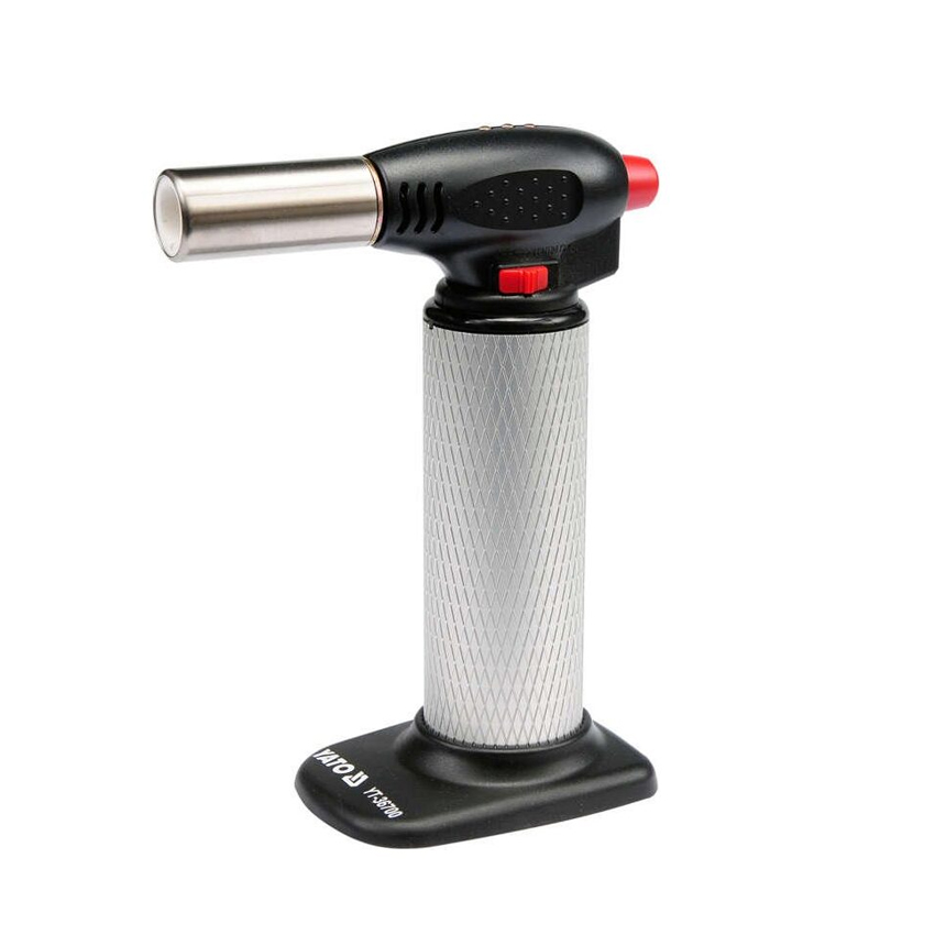 Φλόγιστρο από την Yato με πιεζοηλεκτρική ανάφλεξη που λειτουργεί με αέριο βουτάνιου. Είναι κατασκευασμένο από αλουμίνιο με αντιολισθητική επιφάνεια έχει χωρητικότητα 30 ml, η οποία επιτρέπει 60-90 λεπτά λειτουργίας. Η μέγιστη θερμοκρασία λειτουργίας φτάνει τους 1300 °C.